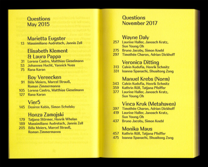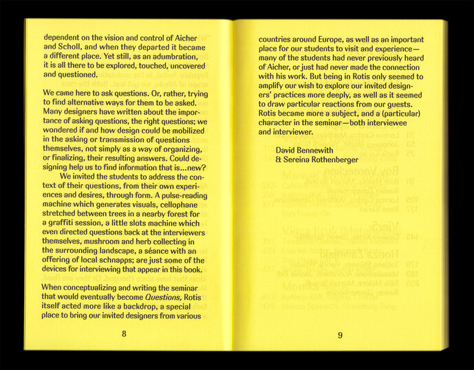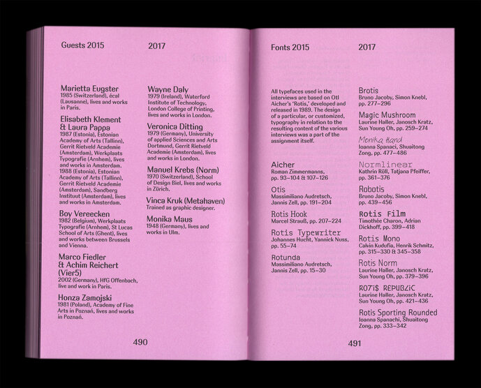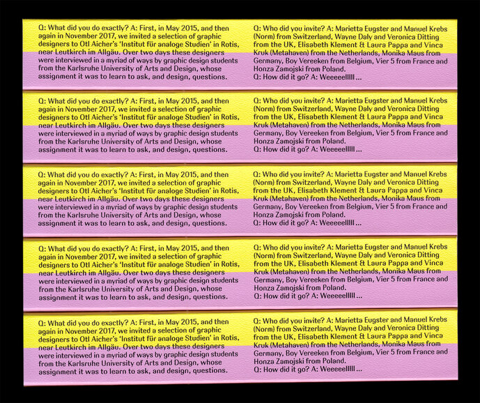 An zwei Tagen wurden die eingeladenen DesignerInnen auf vielfältige Weise von den Studierenden befragt, deren Aufgabe darin bestand, Fragen zu verstehen, zu stellen und zu gestalten. Jedes Interview in diesem Buch wurde von einer Gruppe von Studierenden entworfen, die das Interview entwickelt und auch durchgeführt haben. Teil der Aufgabe war es, für jedes Interview eine Schrift zu entwerfen, die auf Otl Aichers „Rotis“ (1989) basiert. „Rotis“ ist eine universelle Schrift, die irgendwie in ihrer Zeit stecken geblieben ist. Umso bemerkenswerter waren die Redesigns der Studierenden, die im Seminar entwickelt wurden. Alle Ergebnisse zusammen sind eine wilde Mischung verschiedener ästhetischer Ansätze, die von der Perspektive der Studierenden auf die Werke und die InterviewteilnehmerInnen beeinflusst wurde.