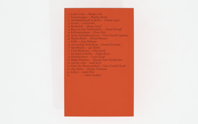 Diesen Fragen gingen – ihrer Reihenfolge „im Keller“ folgend – Markus Grob, Matthias Bruhn, Clemens Lauer, Cécile Kobel, Hanna Jurisch, Daniel Hornuff , Elvira Heise, Víctor Fancelli Capdevila, Richard Brunner, Jana Hofmann, Susanne Kriemann, Igor Hardt, Tobias Kraft, Stephan Krass, Louisa Raspé, Mustafa Emin Büyükcoskun, Isabel Koch, Johan Frederik Hartle, Monika Theilmann, Judith Milz und Anton Stuckard auf den Grund.