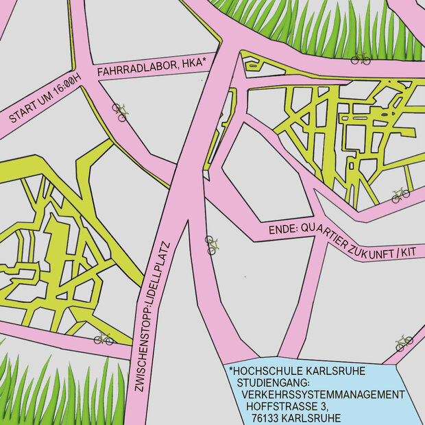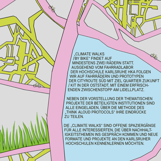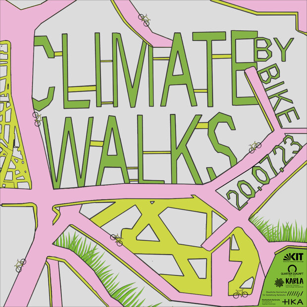 Die Veranstaltung am 20.07.23 steht unter dem Motto "Climate Walks /by Bike" und findet auf mindestens zwei Rädern statt. Ausgehend vom Fahrradlabor der Hochschule Karlsruhe HKA folgen die Teilnehmenden auf Fahrrädern und Prototypen der Cityroute Süd mit Ziel Quartier Zukunft / KIT in der Oststadt, mit einem erfrischenden Zwischenstopp am Lidellplatz. Neben der Vorstellung der thematischen Projekte der beteiligten Institutionen sind die