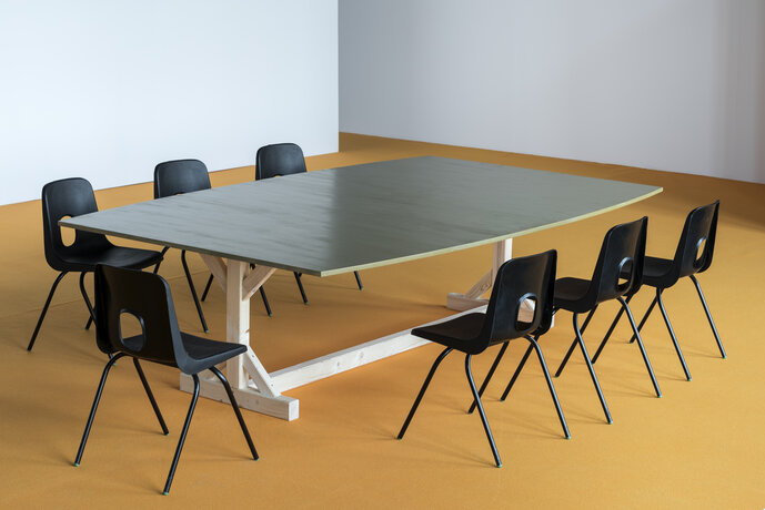 Die von HfG-Student Carlo Siegfried entwickelte Ausstellungsarchitektur begreift den Ausstellungsraum als Bühne. Angelehnt an aktuelle Büroraumarchitektur bindet sie die Handlungen und Bewegungen der BetrachterInnen als Teil einer kollektiv erzeugten, die Filmräume erweiternde Situation ein. An zwei Samstagsveranstaltungen der Reihe Track Academy wird die Bühne mit Workshops, Vorträgen und Performances aktiviert.