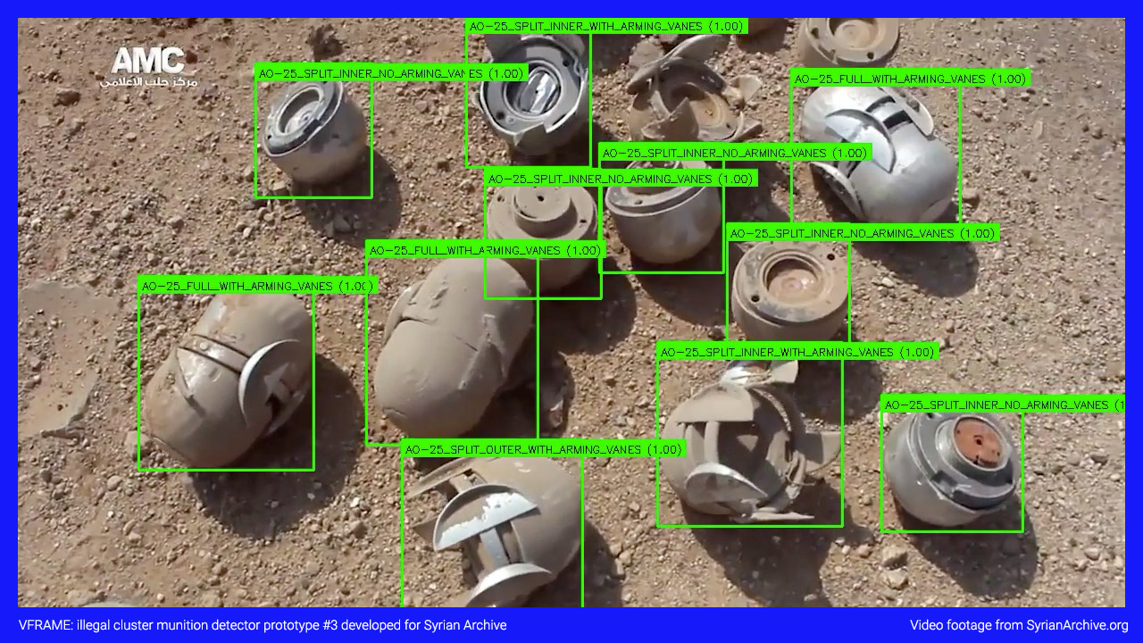 Die VFRAME-Software analysiert Videos und erkennt automatisch, welche Waffen angezeigt werden. Die Idee ist es, künstlicher Intelligenz, die normalerweise im kommerziellen und militärischen Bereich eingesetzt wird, einen neuen Verwendungszweck zu geben und an die Bedürfnisse von Menschenrechtsforschern und investigativen Journalisten wie dem Syrian Archive anzupassen. Das Syrian Archive ist eine Organisation, die sich durch die Arbeit mit Videodateien, die auf soziale Medien hochgeladen wurden, der Dokumentation von Kriegsverbrechen und Menschenrechtsverletzungen widmet. Das visuelle Vokabular von VFRAME ermöglicht es, Beweise für alle Klassen illegaler Waffen zu finden, die vom syrischen Archiv katalogisiert werden.