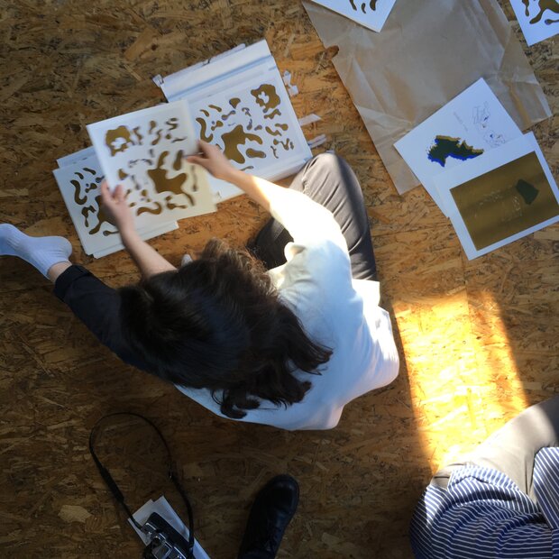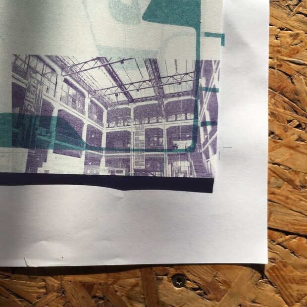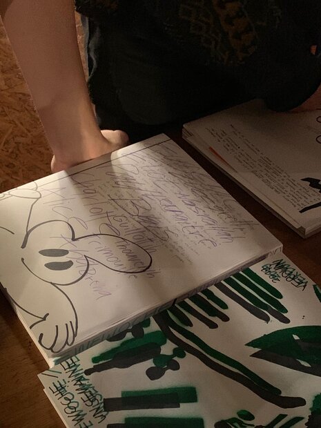 Mit zwei Autos voller Buchbindematerial, Essen für drei Tage und allen siebenseitigen Projekten verließen wir an einem Freitagnachmittag unsere jeweiligen Städte. Der Treffpunkt war eine alte Schraubenfabrik in der Nähe von Verdun, wo wir eine Unterkunft und Arbeitsräume für alle vierzehn von uns fanden und das Wochenende mit einem gemeinsamen Abendessen begannen. Wie der Rest des Austausches war auch die Organisation des Wochenendes auf die Unterstützung aller angewiesen. So wurde beispielsweise jede Mahlzeit von einem Team von zwei oder drei Studierenden zubereitet und von allen geteilt. Am nächsten Tag begann jeder von uns, das handgefertigte Cover für das eigene Exemplar der Publikation zu entwerfen. Das Cover konnte frei gestaltet werden, die einzigen Regeln waren: verwendet nur Elemente der sieben Seiten anderer und das zweisprachige Kolophon, welches das Projekt beschreibt. Natürlich haben wir nicht vergessen, den Samstag mit einer kleinen Party abzuschließen.