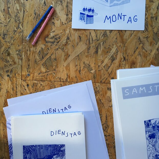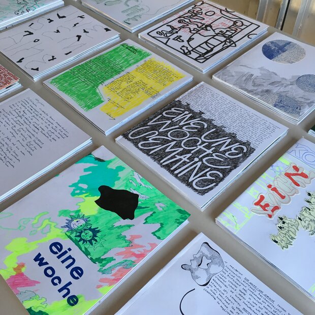 Wir dachten an ein gemeinsames Projekt, an dem alle TeilnehmerInnen als Basis ihrer Mini-Residency arbeiten und die am Ende als grafische Dokumentation des Austauschs zusammengefasst werden sollte. Jeder Studierende musste sieben Seiten über die Erfahrungen in der Gast-Hochschule erstellen und dabei die vor Ort verfügbaren Ressourcen nutzen. Damit alle frei experimentieren konnten, haben wir als einzige Regel das Format 24 x 28 cm und das Thema "Eine Woche/ Une Semaine" aufgestellt. Wir waren sehr neugierig, die Ergebnisse als Interpretation der Erfahrungen aller zu sehen.