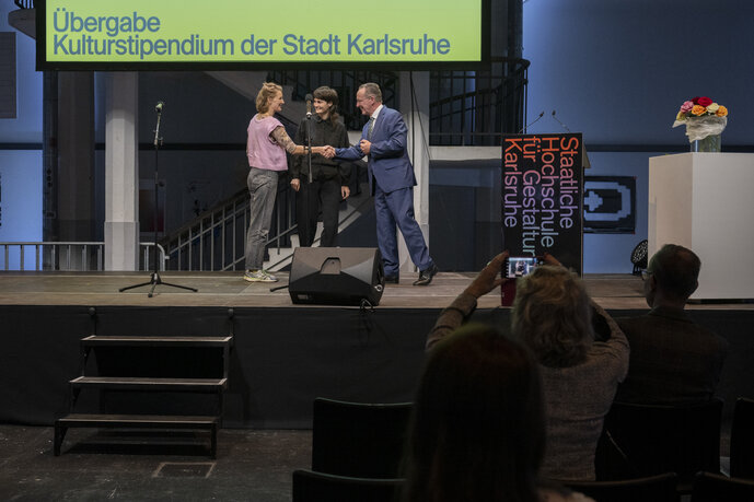 Am Montag, den 17. Oktober 2022 wurde offiziell das Wintersemester 2022/23 der Staatlichen Hochschule für Gestaltung Karlsruhe eröffnet. Dieses Jahr wurde auf der Eröffnung auch das renommierte Kulturstipendium der Stadt Karlsruhe in Höhe von insgesamt 20.000 Euro von Bürgermeister Dr. Albert Käuflein an zwei HfG-Alumnae überreicht. Vera Valentina Gärtner und Leonie Mühlen wurden aufgrund der besonderen künstlerischen Positionen ihrer Abschlussarbeiten mit dem Karlsruher Kulturstipendium ausgezeichnet. Das Stipendium ist für Abgänger der künstlerischen Hochschulen Karlsruhes vorgesehen, die damit ein Jahr lang in Karlsruhe leben, arbeiten und ihre Ergebnisse der Öffentlichkeit präsentieren können.