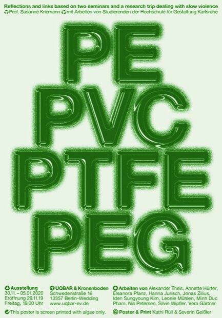Die Ausstellung PEPVCPTFEPEG in den Projekträumen uqbar und Kronenboden ist das Ergebnis der gemeinsamen Forschung. Für ihre Arbeit entwickelte jede/r StudentIn einen individuellen Ansatz, um diese entropische Umweltbedingung zu erfassen und/oder einzufangen. Die hier vorgestellten Arbeiten sind als Reflexionen über die anstehende Aufgabe zu verstehen, geeignete Methoden zur Dokumentation der Langzeitfolgen von „schleichender Gewalt" - und unserer eigenen Verwicklung - zu finden.
