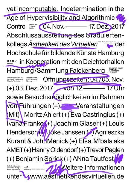 In der Abschlussausstellung "yet incomputable". Indetermination in the Age of Hypervisibility and Algorithmic Control des Graduiertenkollegs "Ästhetiken des Virtuellen" der HFBK Hamburg bieten KollegiatInnen gemeinsam mit internationalen KünstlerInnen Einblicke in ihre künstlerischen Forschungsarbeiten zu Virtualitätsaspekten. Die Gruppenausstellung, kuratiert von der Kunsthistorikerin und Autorin Elena Agudio, befragt hierzu das subversive Vermögen der Kunst im Zeitalter von Sichtbarkeitsregimen und der Kontrolle durch Algorithmen. Dabei geht es um Zwischenräume, die eine künstlerisch-forschende Praxis freilegen kann.