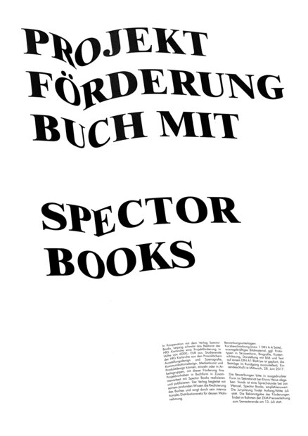 In Kooperation mit dem Verlag Spector Books , Leipzig schreibt das Rektorat der HfG Karlsruhe auch in diesem Jahr eine Projektförderung in Höhe von 6000,00 € aus. Studierende der HfG Karlsruhe aus den Praxisfächern Ausstellungsdesign und Szenografie, Kommunikationsdesign, Medienkunst und Produktdesign können, einzeln oder in Arbeitsgruppen, mit dieser Förderung ihre Projektvorhaben in Buchform in Zusammenarbeit mit Spector Books realisieren und publizieren. Der Verlag begleitet mit seinem profunden Wissen die Realisierung des Buches und sorgt durch sein internationales Distributionsnetz für dessen Wahrnehmung.
