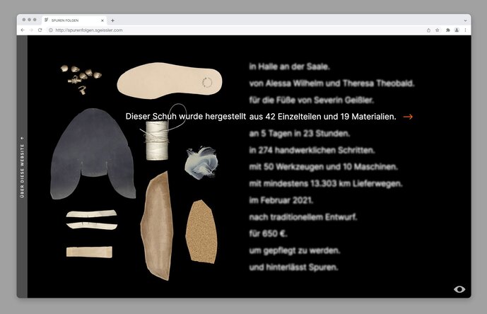 Die Website Spuren Folgen untersucht das Phänomen Produkttransparenz als dringendes Tätigkeits- und Forschungsfeld für visuelle Gestaltung. Wie transparent kann ein Produkt sein? Wie viele Informationen kann man über einen Gegenstand sammeln und welche visuellen Strategien eignen sich um Transparenz durch Kommunikation zu erzeugen? Am Beispiel eines Paars Schuhe wird ein „deep mapping“ vorgenommen, indem die Produktionsprozesse beobachtet, der Schuh in Einzelteile zerlegt, die Materialien zurückverfolgt und über sein Lebensende spekuliert wird. In Form einer Website wird eine digitale Repräsentation des Schuhs erstellt, die seine wirtschaftliche, ökologische und soziale Tragweite entfaltet.