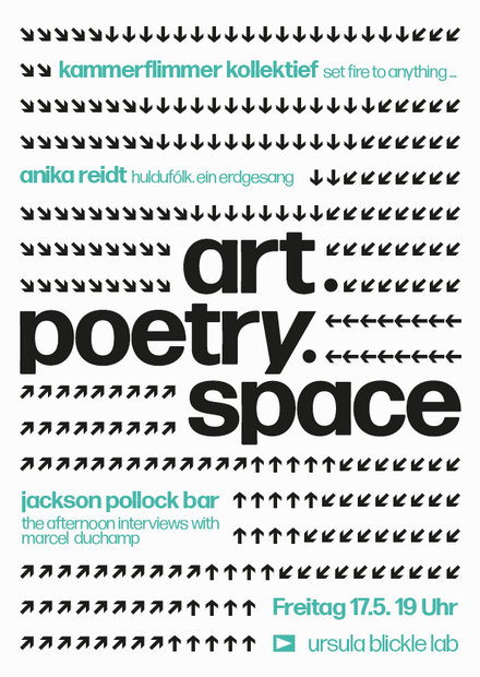 Zum dritten Mal lädt das Ursula Blickle Lab zu art.poetry.space ein. Auch dieses Jahr steht die Schnittstelle von Literatur und Kunst im Mittelpunkt. Das LAB stellt Arbeiten vor, die sich künstlerisch mit der Frage auseinandersetzen, wie der Text in den Raum kommt. Statt der bekannten Syntax öffnet sich eine mehrdimensionale Text-Bild-Konstellation, in der neue Wahrnehmungs- und Assoziationsfelder entstehen. Die Organisatoren Prof. Dr. Stephan Krass und Sebastian Winkler haben für diesen Abend Anika Reidt eingeladen, die, basierend auf ihrem literarischen Text "Huldufólk", eigens eine mehrdimensionale Raumperformance entwickelt hat. Außerdem zeigt die Jackson Pollock Bar mit den für das LAB produzierten "the afternoon interviews with marcel duchamp" eine Uraufführung und das Kammerflimmer Kollektief stellt das neue Programm "set fire to anything..." vor. Die Arbeiten werden am Freitag, den 17. Mai den BesucherInnen in den Räumen der Ursula Blickle Stiftung in Kraichtal präsentiert.