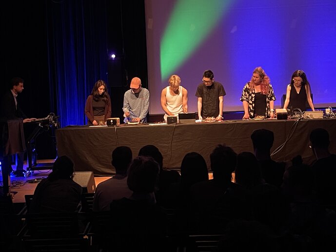 Studierende haben in den Seminaren von Okkyung Lee, Paul Modler und Lorenz Schwarz verschiedene Praktiken im Umgang mit Digitalität, Interfaces und Klang untersucht und Konzepte für Performance, Sound Art und Komposition entwickelt.