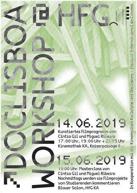 Zusätzlich dazu findet am 15. Juni 2019 ein Workshop an der HfG Karlsruhe statt. Ab 10 Uhr werden Cíntia Gil und Miguel Ribeiro eine Masterclass zu der am Vortag präsentierten Filmauswahl halten. Die Veranstaltung wird allen Studierenden der Bereiche Film und Moving Image besonders empfohlen und kann von allen Interessierten wahrgenommen werden. Nachmittags werden Cíntia Gil und Miguel Ribeiro Filmprojekte von Studierenden kommentieren.