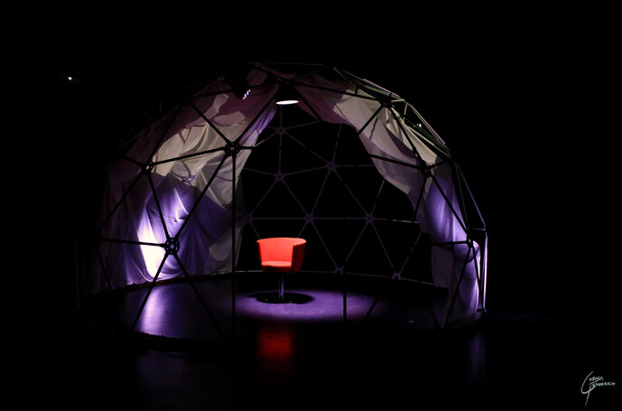 Diese und weitere Fragen habe ich erforscht, Antworten gesucht und meine Erkenntnisse in eine Rauminstallation übersetzt. Das Ergebnis ist eine immersive, sinnliche Darstellung des platonischen Höhlengleichnis innerhalb einer geodätischen Kuppel, angelehnt an Buckminster Fuller. Die Reize werden visuell, auditiv und sogar olfaktorisch gestreut, sodass das Geschehen körperlich wahrgenommen werden kann. Das Erleben der Darstellung wird gesteigert, bis hin zu einer eindrücklichen Erfahrung. Ausgehend von diesem Raummodell lassen sich weitere Überlegungen zu einer grenzenlosen, transparenten Architektur für Theater im öffentlichen Raum anstellen.