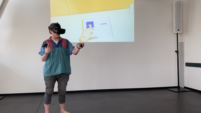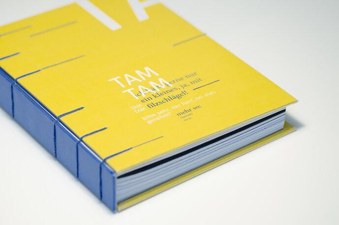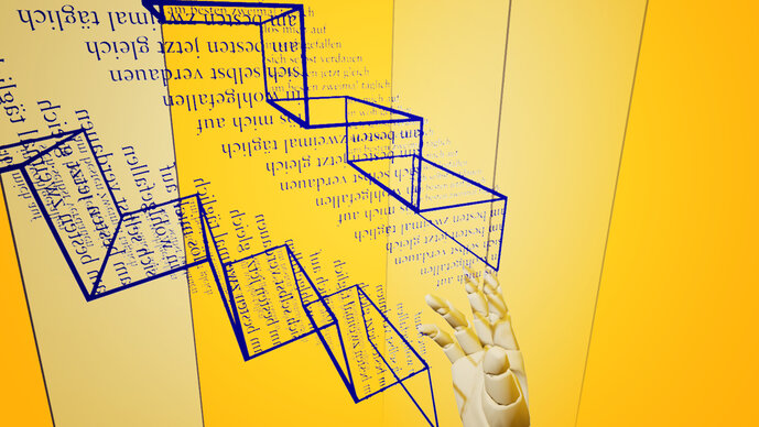 „ein großes TAMTAM“ beschäftigt sich mit Lyrik und visueller Poesie im 2D- und 3D- Raum. Die Arbeit besteht aus einem physischen Buch und einer Virtual Reality-Anwendung, die sich aufeinander beziehen und aufeinander aufbauen, um neue Räume für die Literatur zu eröffnen. Dabei liegt ein besonderer Augenmerk darauf, zu Interaktion und Spiel mit dem Werk einzuladen, in das man durch VR ganz buchstäblich eintauchen kann. “ein großes TAMTAM” möchte die Lesenden dazu anregen, Akteur:innen zu werden, sowie in einen aktiven Dialog mit dem geschrieben Wort zu treten, indem sie Lücken selbst füllen. Die Texte können in VR auf Arten neu entdeckt werden, die in der physischen Welt unmöglich wären. Anfassen ist hier nicht nur erwünscht, sondern essentiell, es soll sogar Hand an das physische Buch gelegt werden, z. B. indem absichtlich ein Eselsohr hineingeknickt oder ein Fenster hineingeschnitten wird. Dadurch werden die interagierenden Personen selbst elementarer Bestandteil des Werks; so sind die Gedichte auch eine Hommage an den:die Leser:in, denn nur durch sie und ihre Interaktion kann es sich sinngemäß entfalten.