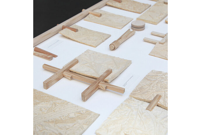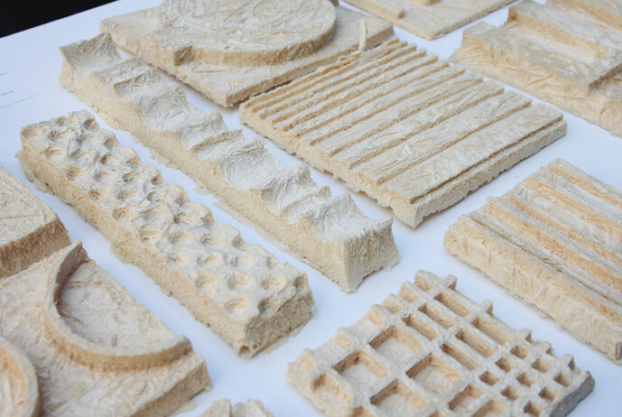 Um dies umzusetzen, suchte Marie Luise Stein nach Kooperationspartner:innen, die ein nachhaltiges Material entwickelt haben, um dieses in eine neue Verwendung, Nutzbarkeit und Anwendung zu überführen. Sie entschied sich für eine Kooperation mit der Firma eco-softfibre, die abgehobelte Lederfalzspäne, die während des Gerbungsprozesses als nicht verwertbarer Reststoff anfallen, als Grundlage eines schadstofffreien und kreislauffähigen Weichschaumstoffs nutzt. Anders als bei herkömmlichem Schaumstoff aus fossilem Erdöl, ist dieser Weichschaumstoff emissionsfrei. Aufgrund seiner schallabsorbierenden Eigenschaften nutzt eco-softfibre ihren Weichschaumstoff bisher hauptsächlich für Trennwände, Wand- und Deckenpaneele.