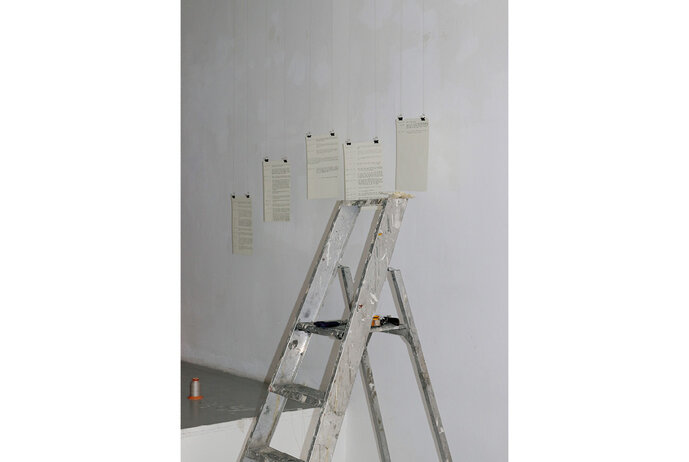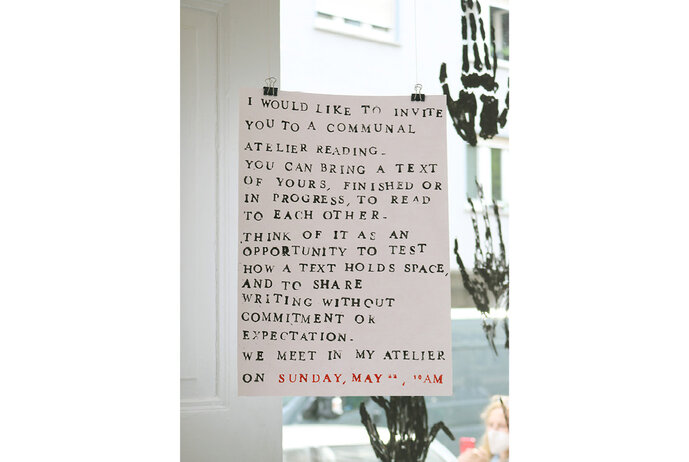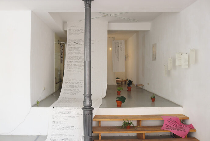 Den Beginn des Prozesses bildete die Schaffung eines Ateliers, welches den räumlichen Rahmen für das Selbstexperiment darstellen sollte. Innerhalb dieses Raums erprobte die Künstlerin das Arbeiten ohne Plan, Konzept und äußere Anforderungen und begann mit verschiedensten Methoden und Instrumenten zu experimentierten. So nähte, malte und zeichnete sie, las von Teenagern geschriebene Geschichten, nahm jede Menge Kaffee und Instant-Nudeln zu sich, baute Dinge, die sie brauchte, organisierte kleine, intime Lesungen, stellte eine Playlist zusammen, tanzte, kümmerte sich um ihre Pflanzen und stellte ihren Schreibtisch immer wieder um. All diese täglichen, reproduktiven wie produktiven Methoden und Routinen dokumentierte Overkott in einem Logbuch mit dem Titel existing quietly. Um auch den während und zwischen diesen Routinen aufkommenden, irrationalen Aspekten – den emotionalen Zusammenbrüchen, den Versuchen der Selbstakzeptanz und der persönlichen Transformation – Ausdruck zu verleihen, setzte sie außerdem all die Textfragmente, die während des Prozesses entstanden waren und u.a. von Pflanzenähnlichkeiten, phantasievollen autonomen Zonen und unhygienischer Queerness erzählen, zu dem Gedicht hallucinating sober, telling stories zusammen. Dieses druckte sie mithilfe einzelner Buchstabenstempel von Hand auf Stoffbanner – ein langes Ritual für sie selbst, um sich ihrem aktuellen Zustand mit all seinen Unvollkommenheiten und unbequemen Aspekten zu verpflichten.