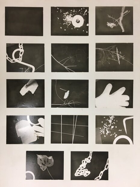 The cloud chamber at the center of this work provides a first glimpse of the invisibility of phenomena that surround us: namely, the activity of radioactive particles from the cosmos (or from radioactive earth sources) that permeate our bodies without our knowing it. As an analog apparatus that reveals abstract lines, Cloud Chamber presents us with the difficult task of deciphering the unknown language of an invisible atomic dimension endowed with an abstract geometric aesthetic. The photograms taken collectively in a uranium mine during a trip to Wismut with the "Red Forest" seminar, with objects and resources found in the tunnels, reveal another level of this unveiling of the visible. As fractal entities, they illustrate the close connection between particular physical contact and the grasping of phenomena that would otherwise approach our understanding only in abstract ways.