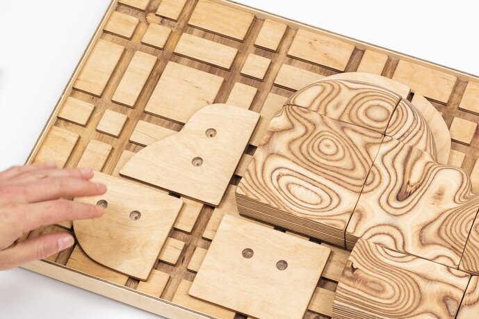 The task for the children is to correctly assemble the puzzle parts. On a display they can see the correct shapes in an interactive application. Tapping the matching cloud shape opens a text that their parents or caregivers can read to them and they learn about the photograph in the sky of the real cloud. In this way, children learn directly which cloud shapes there are in the sky and what weather they bring us.