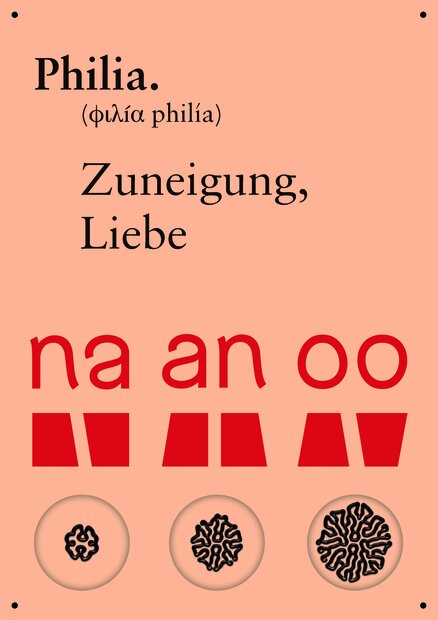 Within four months, the two fonts “Philia” (Greek: affection) and“Metamorphose”(Greek: change) were created. “Philia”, an organic sans serif typeface, is based on the concept of affection. Like most fonts, it does not work with purely additive letters; they are reactive, meaning each letter matches the form of the preceding one. The