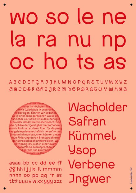 A journey originated in the context of Severin Geissler's intermediate diploma in the spring of 2017. It is a self-initiated exploration into Rudolf Steiner’s anthroposophical ideology. Through the medium of text, Geissler examines Steiner's design theory and his philosophical ideas. The detailed research began with several visits to the Goetheanum in Switzerland, the headquarters of the General Anthroposophical Society and the Free School of Spiritual Science. Parallel to exploring content, Geissler focuses on contemporary techniques of typeface design, aided by the Swiss graphic designer and typographer, Philippe Karrer.