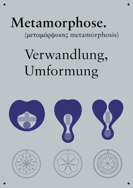 The font “Metamorphose”is based on the principle of metamorphosis, the change from one form to another, and is a central aspect in Steiner’s design theory. All the letters of this font consist of three elements: a circle, a right angle and an organic, fluid form. The flow of the changing organic form determines its character design.
