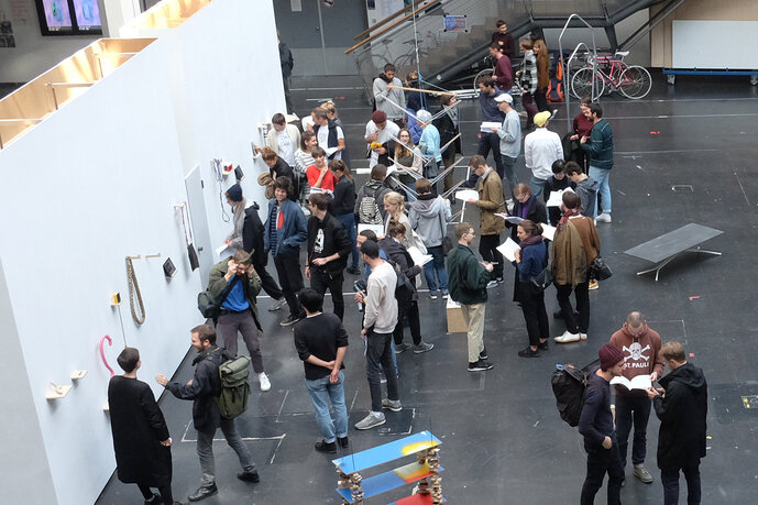 At 100 ideas she stopped collecting. On raids through the university and refuse, she obtained a collection of materials, got a work room with a deck chair and started on the implementation. The design rules she imposed were efficient, intuitive, and did not require intensive research or preparation. There were 30 objects. A selection of 17 works was made for the diploma exhibition. The objects were supplemented by a publication with collected texts, quotes, pictures and figures that accompanied Sophia Hamann during the course of her work. The content covers topics such as work, idleness, laziness, efficiency, sense and nonsense.