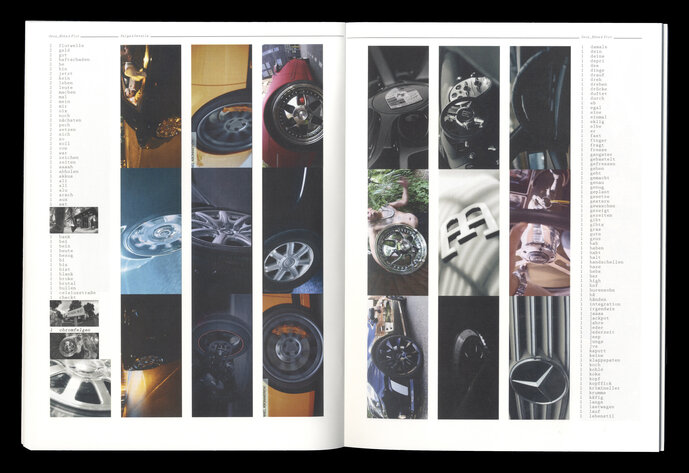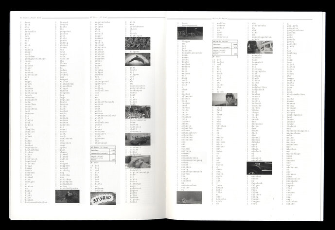 The work ich und die summarizes the research for Tatjana Pfeiffer's intermediate diploma in July 2017. In it, she deals with the vocabulary and visual language of German hip hop. The texts and music videos of this genre are charged with stereotypes in a variety of ways. Typicalto the genre, among other things, is the swaggering appearance of the artists, misogynist texts and violence in the videos. For a better overview, Pfeiffer divided the genre into four categories (mainstream, street, trap and conscious) and assigned 20 artists to each category. She then examined 80 texts and videos for recurring motifs and documented important sequences. The publication shows the frequency of occurring words within a song and arranges the songs alphabetically. The list is interrupted by a sequence of images when a word in the list describes the found motifs. The small pictures under the words also show when texts and videos match. Through the analysis, Tatjana Pfeiffer shows that there are striking similarities in the imagery of the videos, but that there are no noticeable accumulations in the language use. Some of the prejudices that exist about the genre are thus confirmed, at least on the visual level.