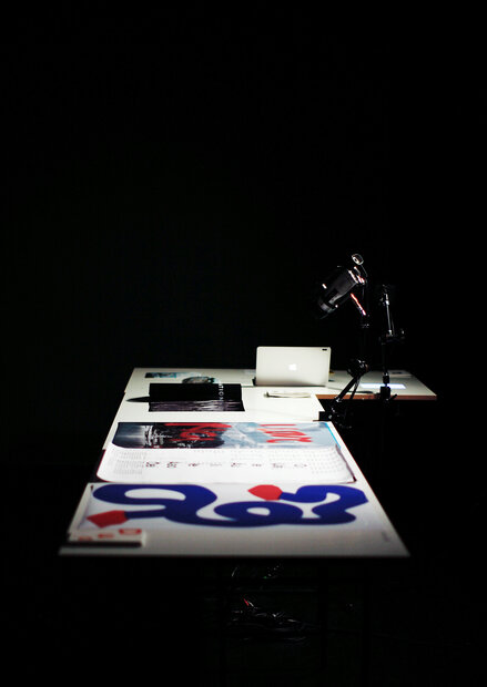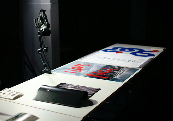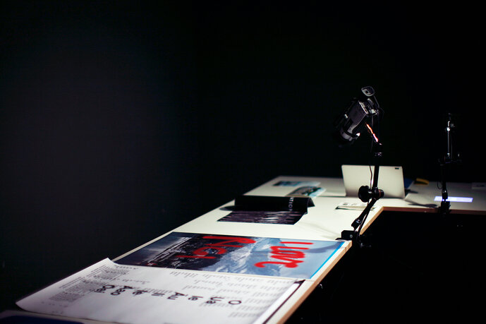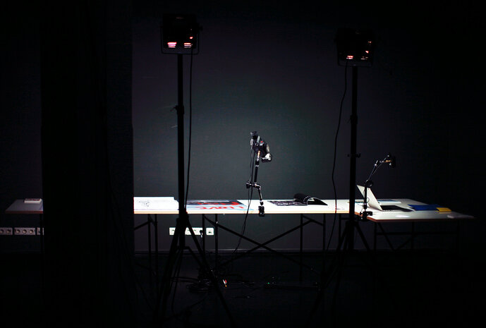 The intermediate diploma in autumn 2016 presented us with the question ofpresentation and moreover, the presentation of your own work. Image, sound andvideo intertwine into a Form of Showingin a darkened presentation room. Memories stacked to tall and sometimes shorter word constructions, thread a loose narrative throughout the works. A pile of printed material ison the table, with a camera pointed towards it. Following the string of sentences, single pages from books are filmed, the zoom of the camera sinks into the posters, then back into full format, page turned, adding to the rhythm of the filming and reciting. The scenes appear on the large canvas behind the speaker’s desk. In place of the normal description, the language complements the projection associatively and sometimes directly then detaches again. The result is a twenty minute presentation of image and narrative, interrupted in the middle by a sound piece. A fragile choreography, a re-telling or also anextension ofan existing work that immerses the audience in its very atmosphere.