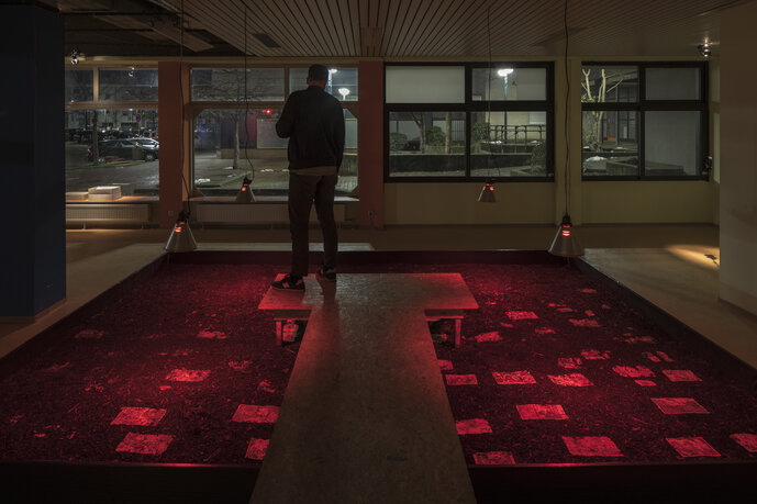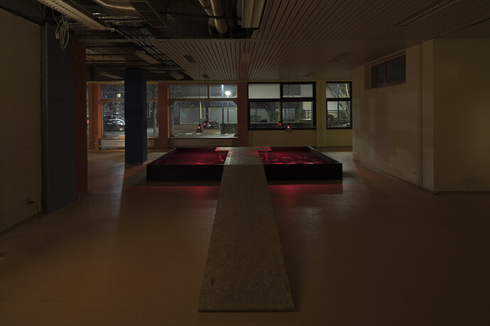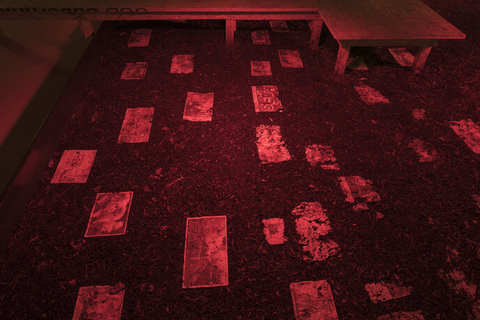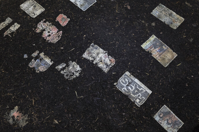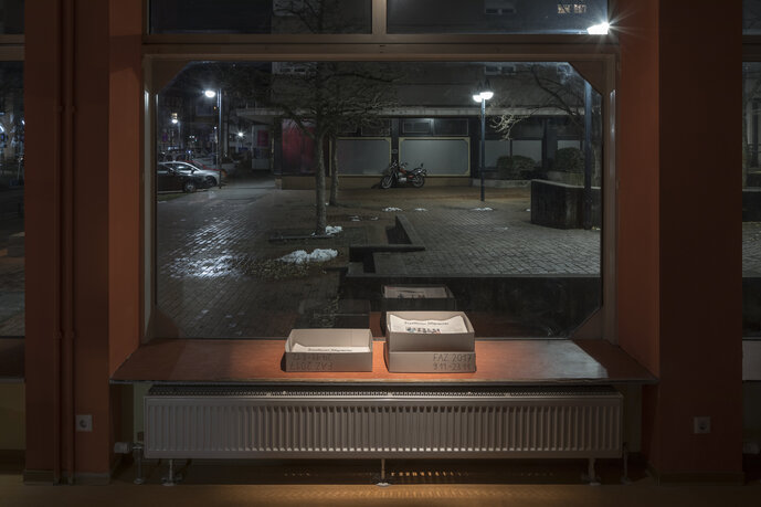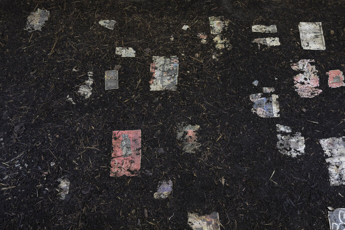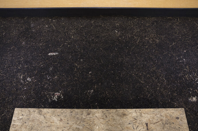 Over a period of four weeks, Ulf Beck experimented with composting, using photographs from the daily press with compost worms. Based on the investigation of which headlines make it to the first page and their photographic representation, he deals with the afterlife of these images. For this, every day he cut out the illustrations of the front page of three large daily newspapers and put them in a grid on a basin with compost soil.