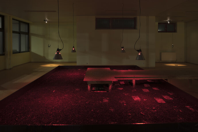 2017, performative installation, variable size, mixed media (sound, newspapers, compost, compost worms, wood, pond liner, cardboard, LED etc.)