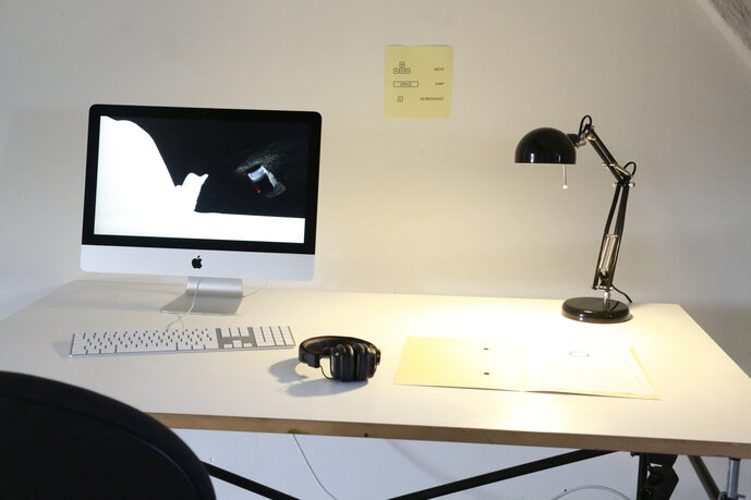 An important component of the entire game installation is the staging in the room. Through a skillfully deployed duplication of reality and fiction, the transition point from one to the other medium is clarified and a leap into the virtual world is suggested.