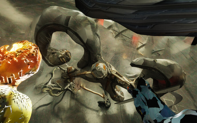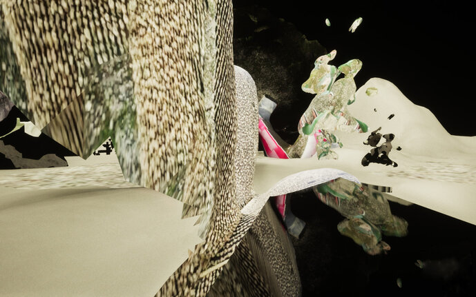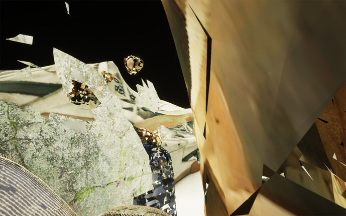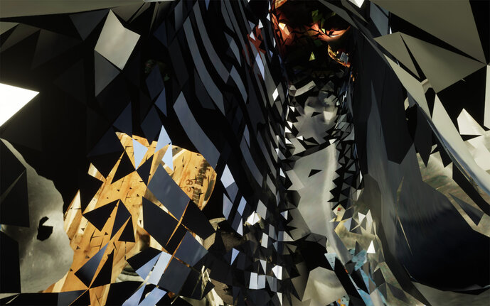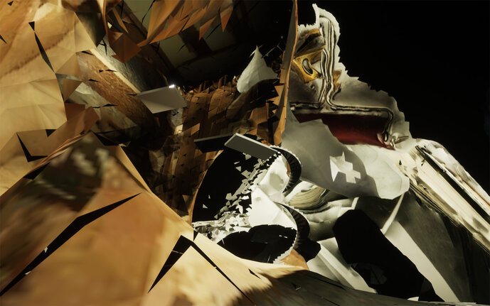 As the application is the latest groundbreaking development of the government's "Office of State Defense" in 2032, the program is still partially prone to error and visualizes the intercepted brainwaves with disruptions. This results in various fragments that cannot be displayed correctly on the user interface; moving too fast, flickering or rotating. In order to keep the extent of all these disruptive effects to a minimum, the system randomly inserts additional platforms and auxiliary elements into the virtual space. The agent is thus assisted to focus on the relevant clues and to see the thought fragments from other perspectives, which may lead to the capture of the offender.