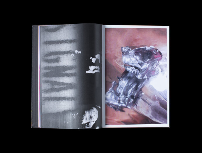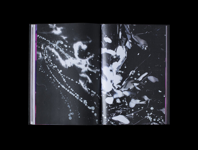 In an analogue process, Jana Hofmann overprints selected pages with the copier, spraying occasionally with black and silver paint.