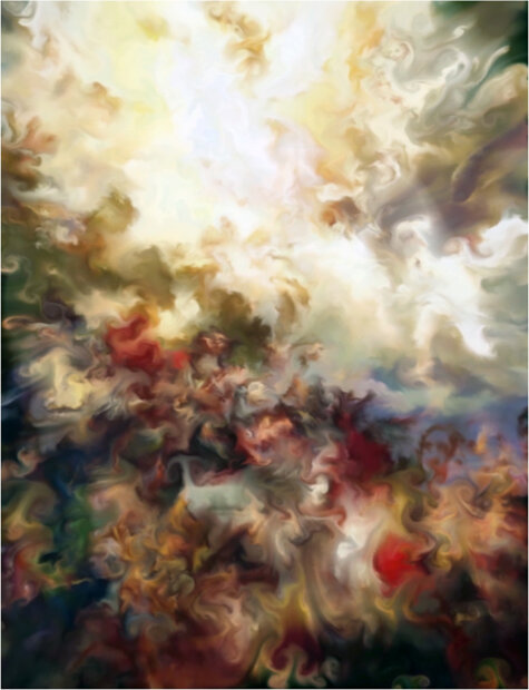 Ascension and Vice Versa features a generative work created using data from 118 historical artworks. The abstract expressionist character of the work relies on the phenomena of data transition and flow simulation, whereas the main content actually remains intact.