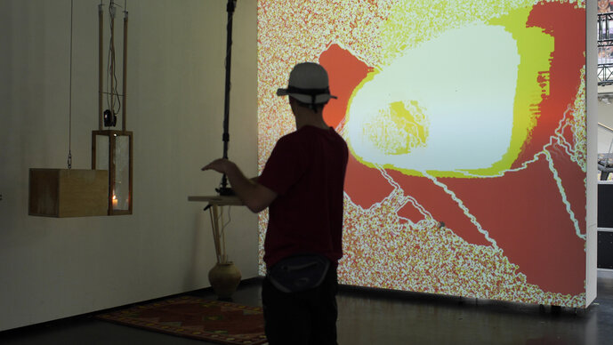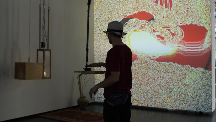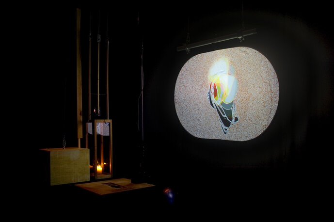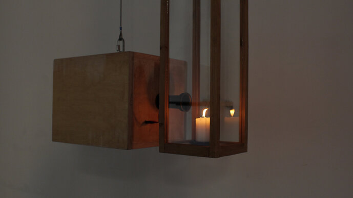 A lantern holding a candle is suspended in the air. A camera is hanging orthogonally above the candle, capturing the image of the flame sitting in the middle of a “circle,” touching upon the “circumference.” The image of the flame generates acoustic waves, propagated by a transducer hanging next to the lantern, focused on the flame. The sound waves interact with the flame, the image transposes itself through sound. Where one ends, the other begins, and vice-versa in a continuous cycle. Through speed, in time the threshold disappears. Visitors can alter “the circling,” and so the projection, by moving their hands in an infrared field that transmits the vibrations through the speaker to the flame.