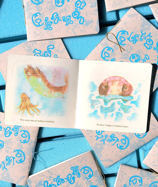 Currents of Change is an independent production by Jessica Kessler, created during her internship at Studio Riso Pop in Amsterdam. The self-written and illustrated zine tells the story of an octopus that changes in search of freedom—a poetic symbol for the struggle to survive in an uncertain world.