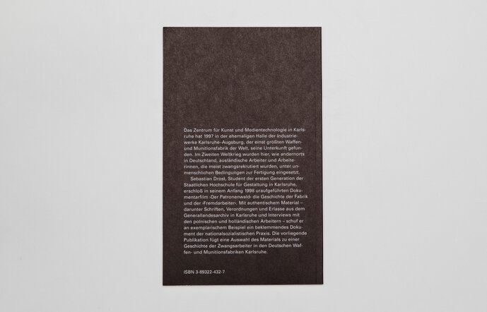Das Zentrum für Kunst und Medientechnologie Karlsruhe hat 1997 in der ehemaligen Halle der Industriewerke Karlsruhe–Augsburg, der einst größten Waffen- und Munitionsfabrik der Welt, seine Unterkunft gefunden. Im Zweiten Weltkrieg wurden hier, wie andernorts in Deutschland, ausländische Arbeiter und Arbeiterinnen, die meist zwangsrekrutiert wurden, unter unmenschlichen Bedingungen zur Fertigung eingesetzt.