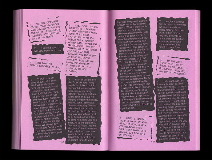An zwei Tagen wurden die eingeladenen DesignerInnen auf vielfältige Weise von den Studierenden befragt, deren Aufgabe darin bestand, Fragen zu verstehen, zu stellen und zu gestalten. Jedes Interview in diesem Buch wurde von einer Gruppe von Studierenden entworfen, die das Interview entwickelt und auch durchgeführt haben. Teil der Aufgabe war es, für jedes Interview eine Schrift zu entwerfen, die auf Otl Aichers „Rotis“ (1989) basiert. „Rotis“ ist eine universelle Schrift, die irgendwie in ihrer Zeit stecken geblieben ist. Umso bemerkenswerter waren die Redesigns der Studierenden, die im Seminar entwickelt wurden. Alle Ergebnisse zusammen sind eine wilde Mischung verschiedener ästhetischer Ansätze, die von der Perspektive der Studierenden auf die Werke und die InterviewteilnehmerInnen beeinflusst wurde.