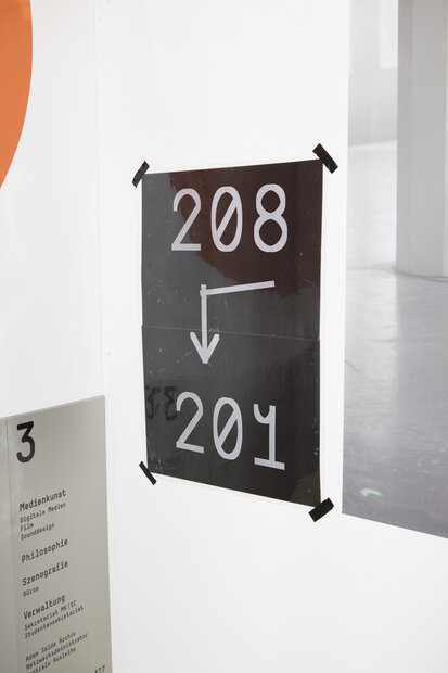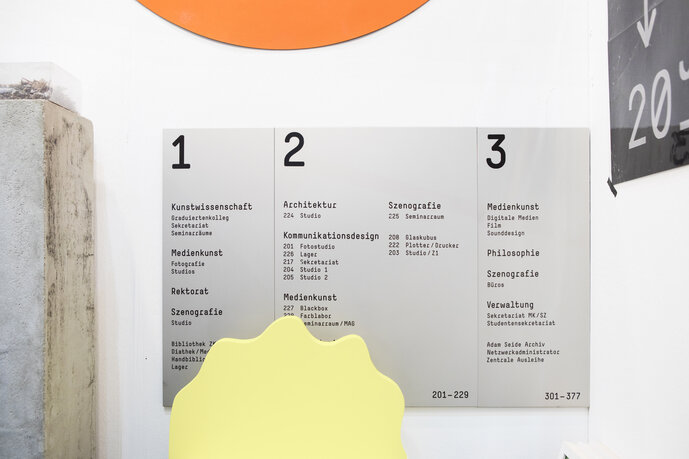 Im Jahr 2000 von Studierenden entwickelt, sollte sich das neue Leitsystem die Eigenheiten des denkmalgeschützten Gebäudes, einer ehemaligen Munitionsfabrik, zunutze machen und doch einen größtmöglichen Kontrast zum creme-weiß-grauen, rechtwinkligen Industriebau bilden. Die mit Metallpaneelen verkleideten Gebäudeträger und metallenen Türrahmen dienten als Befestigungsträger für die orangefarbenen, runden Magnetschilder in unterschiedlichen Größen. Das flexible System sollte dem kreativen Charakter der Hochschule entsprechen, nächtliches Vertauschen der Schilder war einkalkuliert.