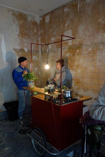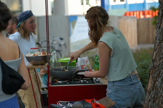 Die Fahrradküche, kurz FK, ist eine Antwort auf das Seminar RECHT AUF STADT mit Johan Hartle und Andreas Müller. Die Stadt erkundend wurden sozialpolitische Fragen und Gedanken zu Themen wie Kapitalismus, Öffentlichkeit, Eigentum, Lebensweise, Freiraum und Mitgestaltung aufgeworfen. Begleitet wurden diese Spaziergänge von verschiedenen Texten wie beispielsweise denen Henri Lefebvres, die in einem aktuellen Kontext innerhalb der Stadt neu betrachtet wurden.