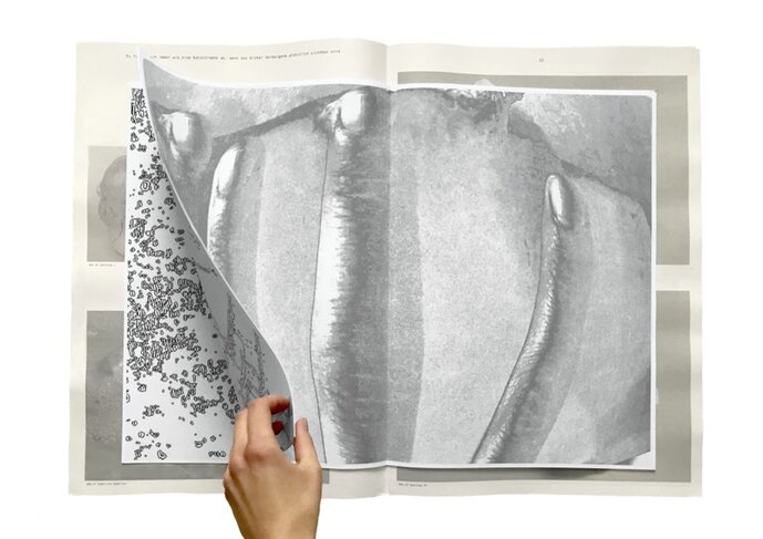 SPUREN ist eine Publikation, die ein experimentelles Untersuchen des Verborgenen beinhaltet. Um sich mit dem Thema auseinanderzusetzen, muss das Verborgene in die physische Welt transferiert werden. Das Ungreifbare wird in mehreren Objekten manifestiert. Die BetrachterInnen werden diese Objekte jedoch nie zu Gesicht bekommen. Die Publikation ermöglicht zwar einen gelenkten Blick auf die Objekte, doch kann das Objekt nie als Ganzes erfasst werden. In 23 Thesen wird versucht, sich einem Thema voller Widersprüchlichkeit anzunähern. Doch kann dies nur gelingen, wenn sich die Thesen selbst widersprechen. Die Objekte des Verborgenen werden daher auf übergroßen Papierbögen offengelegt und radikal sichtbar gemacht. Die Publikation ist ein Zusammenspiel von Sichtbarmachen und Verbergen.