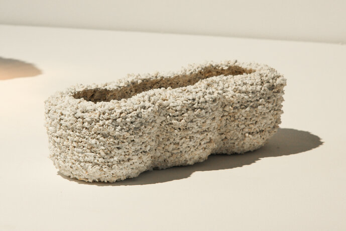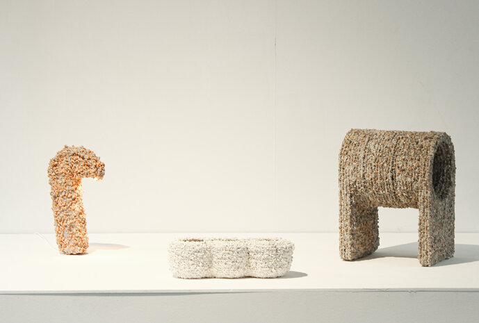 Durch ein eigens für dieses Projekt neu entwickeltes 3DDruck Verfahren lassen sich Freiformen aus „Waschbeton“ drucken. Eine kontrollierte Dosierung des Materials ermöglicht einen ressourcensparenden Prozess, der ohne jegliche stützende Strukturen auskommt und bisher unmögliche Formen zulässt. Die Stabilität der Drucke ist mit herkömmlichen Waschbeton zu vergleichen. Alle hier ausgestellten Entwürfe zeigen eine ungewöhnliche Oberfläche in Kombination mit einer klaren Formsprache, einer eigenen Ästhetik und realen Nutzungsmöglichkeiten.
