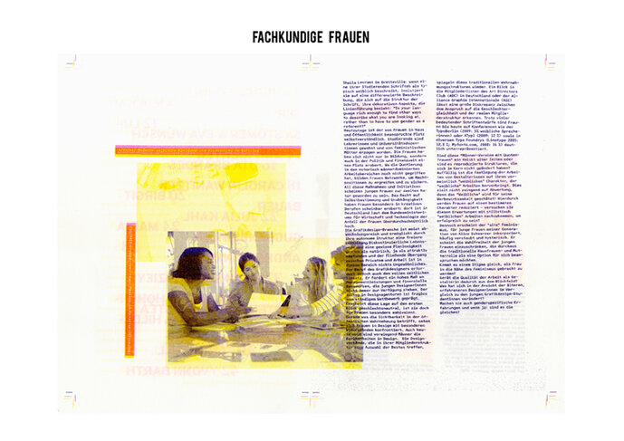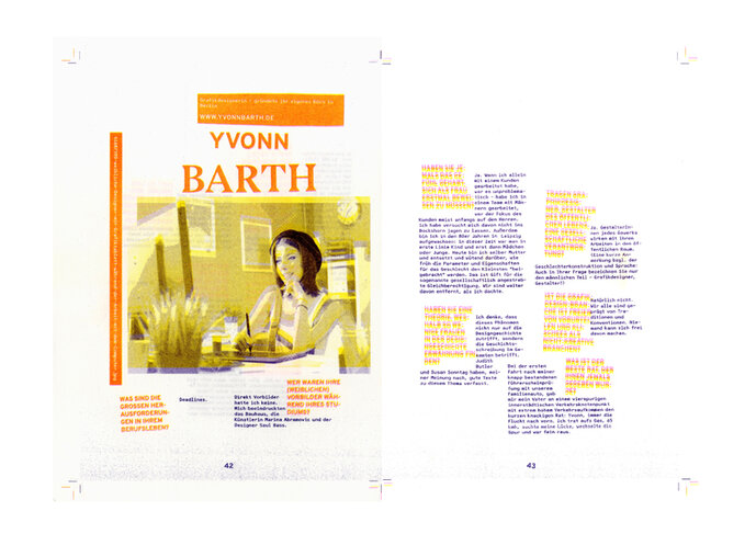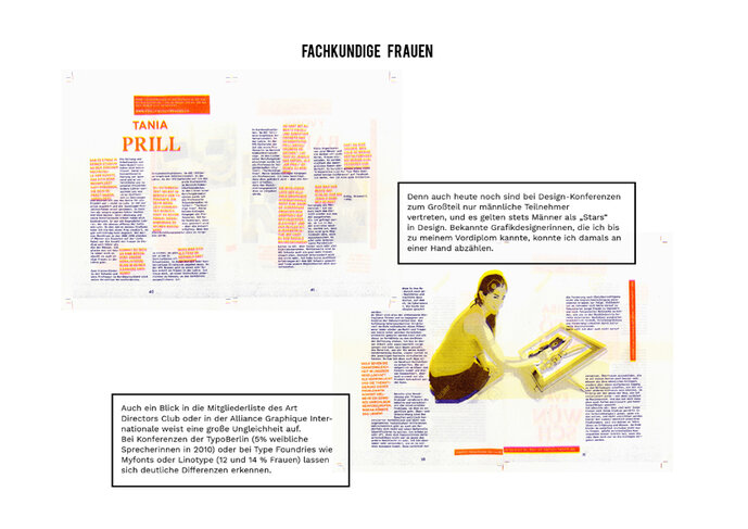 Im Rahmen ihres Vordiploms interviewte Emma-Lilo Keller Grafikdesignerinnen, darunter Tania Prill und Anja Kaiser (Lehrbeauftrage an der HfG Karlsruhe), Yvonn Barth sowie Grafikdesign-Studentinnen. Die Fragen drehten sich um die Sichtbarkeit von Frauen in diesem Berufsfeld: Ist die Grafikdesign-Branche wirklich freier von Vorurteilen als die nicht-kreative Branche? Wohin „verschwinden“ die vielen Studentinnen? Sind reine Frauennetzwerke hilfreich oder eher kontraproduktiv?