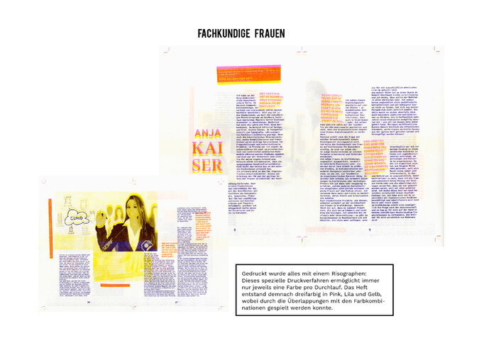Die Ergebnisse der Interviews und der Recherche wurden in einem Heft festgehalten, das die Sicht der darin interviewten Grafikdesignerinnen auf ihre berufliche Situation, ihre Branche sowie die herrschenden Vorurteile darstellt. Gedruckt wurde mit einem Risographen: Dieses spezielle Druckverfahren ermöglicht immer nur jeweils eine Farbe pro Durchlauf. Das Heft entstand dreifarbig in Pink, Lila und Gelb.