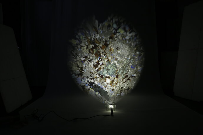 Das Petroskop gibt einen Einblick in die Petrologie (aus dem Griechischen πέτρα, pétra, Stein) und zeigt, wie unterschiedlich Gesteine aufgebaut sind und was für ein Farbenspiel sich aus solch einem dichten Material ergeben kann. Das Petroskop projiziert einen vergrößerten Ausschnitt des petrologischen Dünnschliffs an die Wand. Ein Dünnschliff ist ein Gesteinspräparat mit einer Dicke von 20 bis 30 µm. Er ist so dünn, dass der sonst so massiv wirkende Stein transparent wird. Optik und Lichtquelle des Petroskops sind durch Magnete verbunden und können auf dem Präparat bewegt werden, um unterschiedliche Ausschnitte projizieren zu können. Optional können Polarisierungsfilter eingesetzt werden, die das Licht in den unterschiedlichen Mineralien des Gesteins brechen.