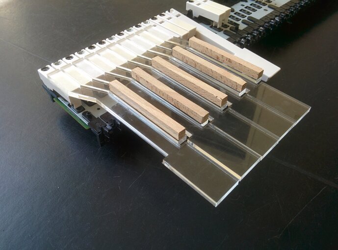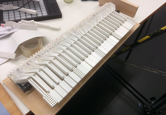 Eine solche generische, gleichschreitende Bedienungsoberfläche führt allerdings leicht zu visueller und taktiler Orientierungslosigkeit beim Spielen. Um dem entgegenzuwirken, wurden bestimmte Tasten mit einer Oberflächenstruktur versehen, so dass diese mit den Fingern blind ertastet werden können. Außerdem zeigt eine farbige, dynamische Tastenbeleuchtung an, wo der Grundton liegt, welche Tasten innerhalb einer bestimmten Skala liegen und welche außerhalb. Die Skala kann frei vom Spieler digital bestimmt werden und die Beleuchtung passt sich direkt an die Auswahl an. Im Prototypen, der zum Diplom vorgestellt wurde, werden die Tasten durch Projection-Mapping beleuchtet. Das finale Konzept sieht jedoch vor , die Tasten von innen zu beleuchten. Das Projection-Mapping ist in der Software „Cycling 74 Max“ so programmiert, dass man die Skala und Farbe mit einem zusätzlich angeschlossenen “Ableton Push 2” Controller auswählen kann, sodass sich die Projektion in Echtzeit anpasst. Nach dem finalen Konzept wäre eine solche Auswahloption direkt im Gerät integriert. Durch den höheren Anteil schwarzer Tasten pro Oktave (6 schwarze, 6 weiße statt 5 schwarze, 7 weiße) ergeben sich ergonomische Probleme beim Spielen in den Zwischenräumen. Zur Lösung dieser Probleme wurden die Dimensionen der Tasten neu ausbalanciert: Die schwarzen Tasten wurden sowohl schmaler als auch weniger hoch, die weißen Tasten leicht breiter angelegt.