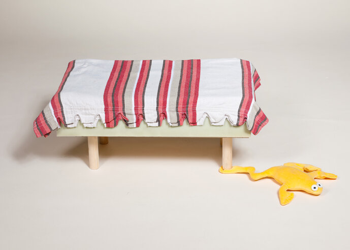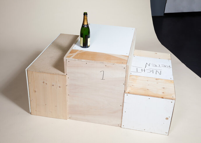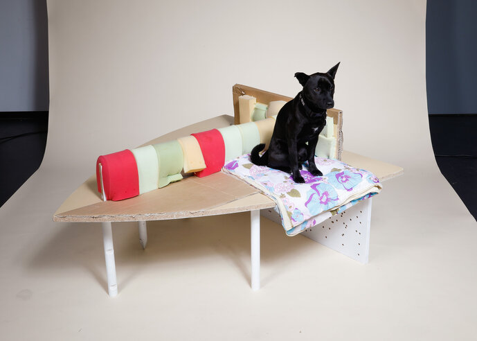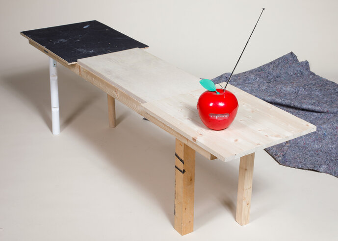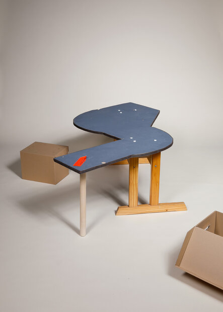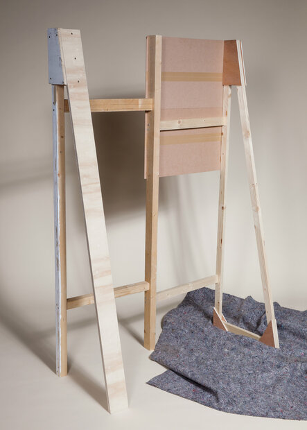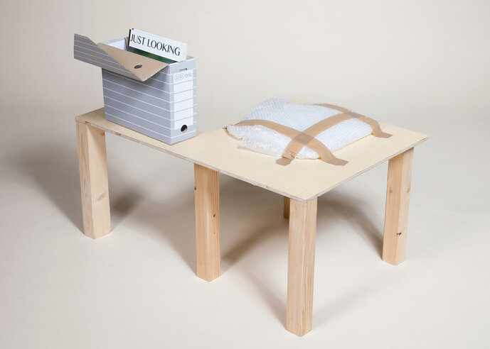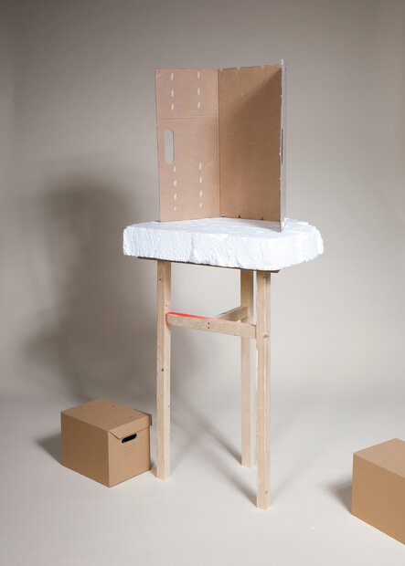 Im Zentrum des Ausstellungsdesigns von Diane Hillebrand stand, wie im Projekt selbst, der Dialog. Die Ideen zur Gestalt der Möbel entstanden intuitiv aus beiläufigen Gesprächen mit anderen Studierenden der HfG Karlsruhe. Formgebend für den Grundriss der einzelnen Ausstellungsmöbel waren Materialien aus anderen Projekten, zu denen gefundene oder geschenkte Materialien hinzukombiniert wurden – als Tischbein, Sitzoberfläche oder Regalbrett. Der nicht verabredete Austausch und die wiederholte Kommunikation über das Material oder spontanes Zusammenarbeiten waren grundlegende Momente im Entstehungs- und Entscheidungsprozess. Durch den partizipatorische Akt wurde die Unkenntnis der einzelnen Beteiligten über das gesamte Projekt kompensiert und die Entstehung distanzierte sich gleichzeitig von Planungsmechanismen wie Kostenkalkulation, Terminierung, Materialbestellung oder Öffnungszeiten. Das Prinzip „Form Follows Function“ wird hier radikal umgesetzt. Um den kapitalistischen Strukturen und ihren dazugehörigen Mechanismen zu entkommen, richtete Diane Hillebrand einen davon möglichst unabhängigen Arbeitsplatz für die Entstehung des Mobiliars ein. So sind Arbeitsplatz und -prozess ebenso offen wie die Formgebung der Ausstellungsmöbel selbst. Aus dem Potpourri verschiedenster Materialien – Schaumstoff, Styropor, Holz, Spanplatten, Pappe – werden fragmentarisch Stücke, die ihre ursprüngliche Funktion nie einnehmen durften oder diese wieder verlassen haben, eklektizistisch zu einer Sitzgelegenheit, einem Regal oder einem Tisch zusammengefügt. Trotz der Beteiligung Vieler behält die Designerin die Autorschaft, aus der sich die Verwandtschaft zwischen den von Grund auf verschieden Möbeln ableiten lässt.