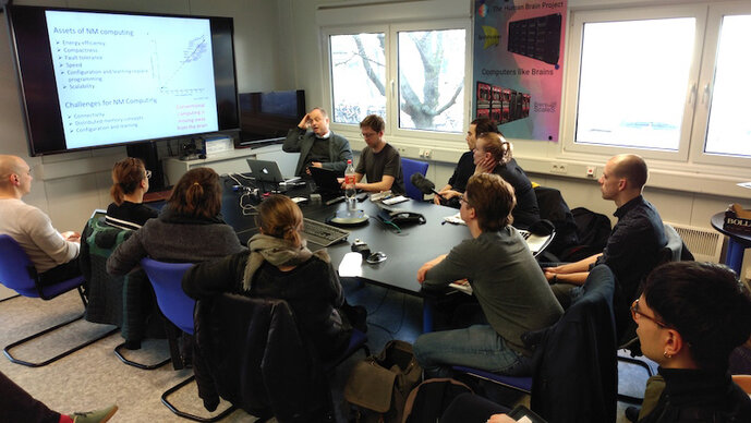 HfG-Studierende der Forschungsgruppe KIM besuchten die Forschungseinrichtungen des Human Brain Project in Heidelberg und nahmen an einer Vorlesung des Mitinitiators des Projektes, Prof. Karlheinz Meier, teil. Das Human Brain Project zielt darauf ab, das komplexe Organ, das für unsere menschliche Existenz so zentral ist, zu emulieren und zu verstehen: das Gehirn. Die so entstehende „Denkmaschine“ wurde mit einem neuen, nicht digitalen Modell künstlicher Neuronen konzipiert und wird die Größe eines vierstöckigen Gebäudes haben. Wenn das oben erwähnte Zitat von Frank Rosenblatt (Erfinder der ersten neuromorphen Maschine mit künstlicher Intelligenz) gültig ist, kann die derzeit in Heidelberg gebaute Einrichtung ein historischer Schritt in Richtung des Verständnisses mentaler Prozesse sein.