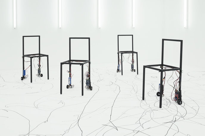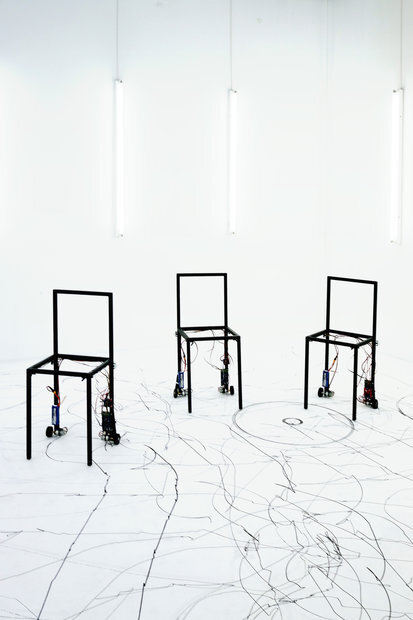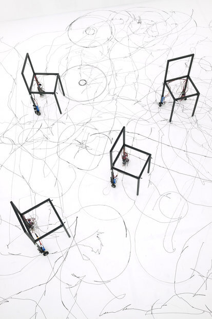 In seiner Diplomarbeit hat sich Moritz Jähde in einem Versuchsaufbau damit auseinandergesetzt, wie man vier Stühlen exemplarisch eine Form individueller Wesenhaftigkeit verleihen kann, die sich nicht in der Erfüllung menschengemachter Bedürfnisse äußert. Jeder der Stühle verfügt über einen Microcontroller (Arduino) mit individueller Programmierung, Antriebstechnik, Kantenerkennung sowie Akkus, Motoren und Räder. Darüber hinaus verfügen die Stühle über PIR-Sensoren, mit denen sie partielle Veränderungen im Temperaturfeld ihrer Umgebung wahrnehmen können, so dass registriert wird, ob sich ein Mensch in der Nähe befindet. Solange dies nicht der Fall ist, die Dinge also unter sich sind, bewegen sich die Stühle anhand zufällig kombinierter Parameter. Ob, wie lange und wohin sie sich bewegen, ist zu keinem Zeitpunkt vorhersehbar. Betritt mindestens eine Person den Raum, verharren die Stühle an ihrer aktuellen Position. Auf die Ortsänderung verweisen lediglich Linien, die die Bewegung auf dem Boden nachzeichnen. Die Art der Programmierung erlaubt es allerdings mithilfe eines Tricks, die Bewegung der Stühle kurzzeitig zu sehen: Hält der Betrachter für eine bestimmte Zeit komplett still, so wird er von den Sensoren für einen Teil der Umgebung gehalten und nicht mehr als Person registriert – der Mensch wird so selbst zum statischen Objekt, um nicht zu sagen: Zum Möbel.