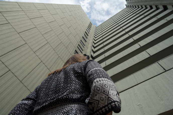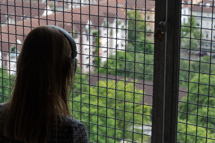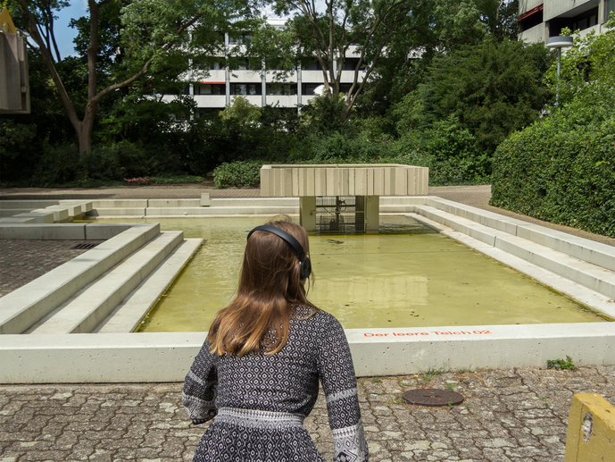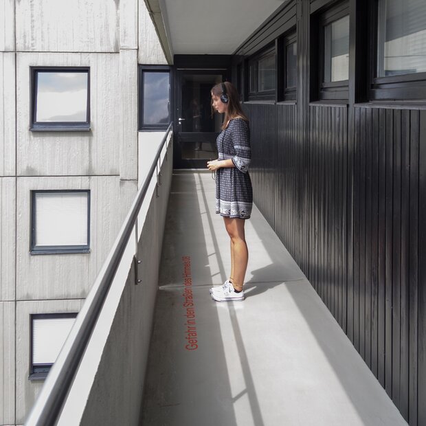 Der HOCHHAUS Audiowalk führt die TeilnehmerInnen an spezifische Orte des Hochhauses der Kaiserallee 15 in Karlsruhe und lässt das Gebäude zum Hauptakteur werden. In neun Audiotracks werden collageartig Texte aus verschiedenen Perspektiven verarbeitet. Die selbst in betreffendem Hochhaus lebende Künstlerin kombiniert sowohl ihre eigenen Beobachtungen innerhalb des Hochhausterrains als auch die von anderen BewohnerInnen mit Zitaten aus einer historischen Werbebroschüre für den Wohnkomplex, mit Originaltönen aus einem Interview mit dem Hausmeister, der sich schon seit der Fertigstellung um das Gebäude kümmert, und mit Auszügen aus J.G. Ballards Roman Hochhaus aus dem Jahre 1975. Die Tracks sind mit ausgewählten Kapitelüberschriften aus dem Roman betitelt. Sie leiten die Erzählung und bezeichnen die Orte, an die die AudiowalkteilnehmerInnen von einer Erzählstimme mit verbalen Anweisungen geführt werden. Durch die Mischung von fiktionalem, dokumentarischem und originär geschaffenem Material entstehen vier Text- sowie verschiedene Zeitebenen: Die des Hochhausbaus, jene des Romans und die Ebene der Gegenwart. Sie verflechten sich zunehmend, wobei der Hausmeister als (reale) Figur und Interviewpartner zwischen diesen Zeiten steht und als Bindeglied fungiert. Das Gehörte wird durch die visuelle Wahrnehmung der AudiowalkteilnehmerInnen, die alleine dem Aufstieg eines Protagonisten aus dem Roman in die oberen Etagen des Betonriesen folgen, ergänzt. Abgespielt wird der Audiotext über einen handlichen MP3-Player und Kopfhörer. Der Romantext stammt aus der Zeit des Betonhochhausbooms der Siebziger Jahre. Das ist auch die Zeit, in der der Hausmeister der Kaiseralle 15 eine neue Arbeit fand und aus dem Einfamilienhaus in Bayern in das Hochhaus zog, das er nie mehr verlassen sollte. Aus dem Roman entnommen sind bestimmte Figuren, spezifische HochhausbewohnerInnen, die die TeilnehmerInnen auf ihrem Weg durch das Gebäude begleiten und deren Rolle sie immer wieder durch ihre physische Präsenz am Ort einnehmen können. Dem gegenübergestellt sind die Berichte des Hausmeisters und die Beobachtungstexte. Die von Ballard erdachte Extreme, in der das Hochhausleben in völliger Abschottung im Chaos anarchistischer Zustände endet, überlagern sich mit den Aussagen des Hausmeisters. Die Interviewaussagen in Verbindung mit den anderen Textebenen schaffen einerseits Diskrepanzen, andererseits aber auch eine Verbindung zwischen Fiktion und Realität. Das akustische Konzept umfasst nicht nur die gesprochenen und gelesenen Texte sowie die Atmo-Aufnahmen aus dem Haus und seiner Umgebung, auch musikalische Einschübe unterstützen das Klangkonzept. Vollständig realisiert dieses sich aber erst in der Durchmischung der Klänge aus dem Kopfhörer mit den real vor Ort präsenten akustischen Ereignissen. Die TeilnehmerInnen erleben es in Verbindung mit ihren eigenen Handlungen und den vielfältigen Sinneseindrücken durch ihre körperliche Präsenz.