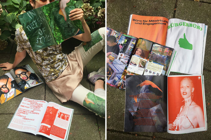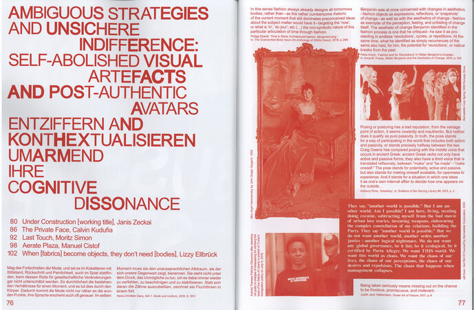 Unsere Recherchen und die daraus resultierenden 13 Projekte verhandeln eben dieses gestalterische Potenzial von Mode als öffentliches Ausdrucksmittel. Entlang der faszinierenden Verstrickungen von Mode, ihren Zeichen, Psychologien, Industrien und Schauplätzen navigieren sie zwischen Warenfetisch und Kunstform, Schnelllebigkeit und Selbstausdruck, Virtualisierung und Körperlichkeit, Ausbeutung und Empowerment.